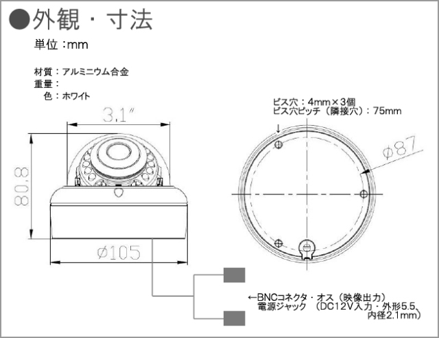 【3年保証+PL保険】防犯カメラ|AHD・CVI・TVI・アナログCVBS・全対応|4INマルチシステムタイプ|ドーム型|ES-CD600HW/V