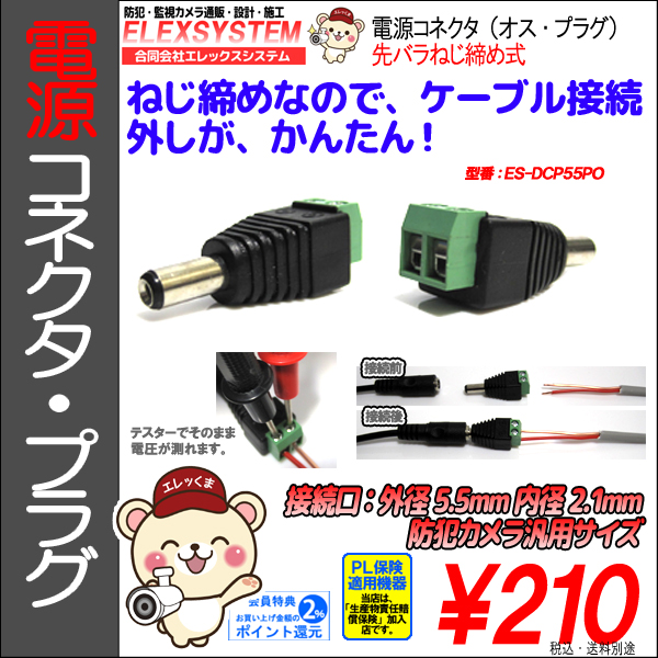 防犯カメラ・DC12Vケーブルサキバラ用コネクタ|オスプラグ・ネジ締式取付/1個単体販売|ES-DCP55PO