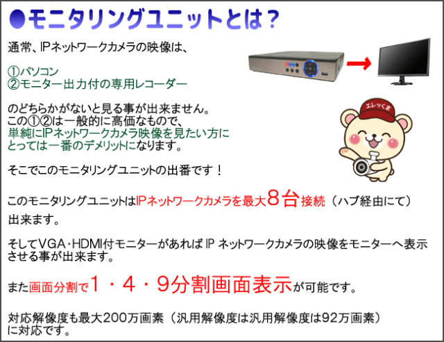 【3年保証】ネットワークカメラ・IPカメラ用8CHモニタリングユニット|日本語メニュー・HDMI・VGA出力・1080P・200万画素対応|ES-MT708N【Ver.U236】